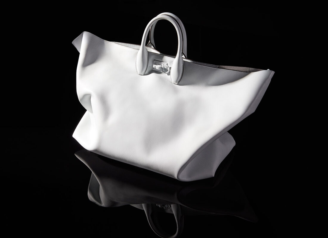 Zapatos: el calzado clave incluye botas de motociclista espacial, zapatillas deportivas tipo calcetín, zuecos en napa de goma y una elegante reinterpretación del icónico tacón F de Ferragamo adornado con pedrería y un acabado galvanizado. Accesorios: Las bolsas incluyen el Nano-Trifolio en napa de goma y una bolsa Studio revuelta y deconstruida. Una bolsa de viaje para hombre viene en un futurista cuero con relieve de Gancini y cuenta con una correa utilitaria en el bolsillo.