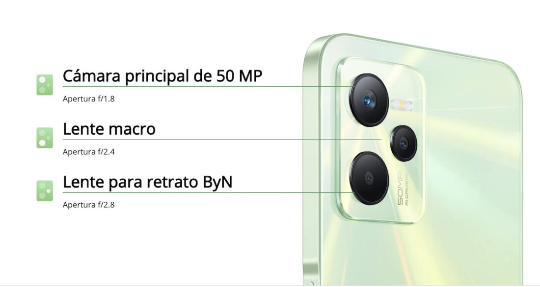 1. Elegante sistema triple de cámara de 50MP con IA. Para capturar fotografías de nivel insignia, el realme C35 cuenta con una cámara principal de 50MP con gran apertura de f/1.8, lo que permite detalles más nítidos en cada foto. Esta característica lo convierte en uno de los smartphones más potentes de su gama. Y para los más aficionados a la fotografía, el realme C35 adopta un lente B&N con f/2.8, dedicado para para tomas de retrato y vista macro de hasta 4cm.